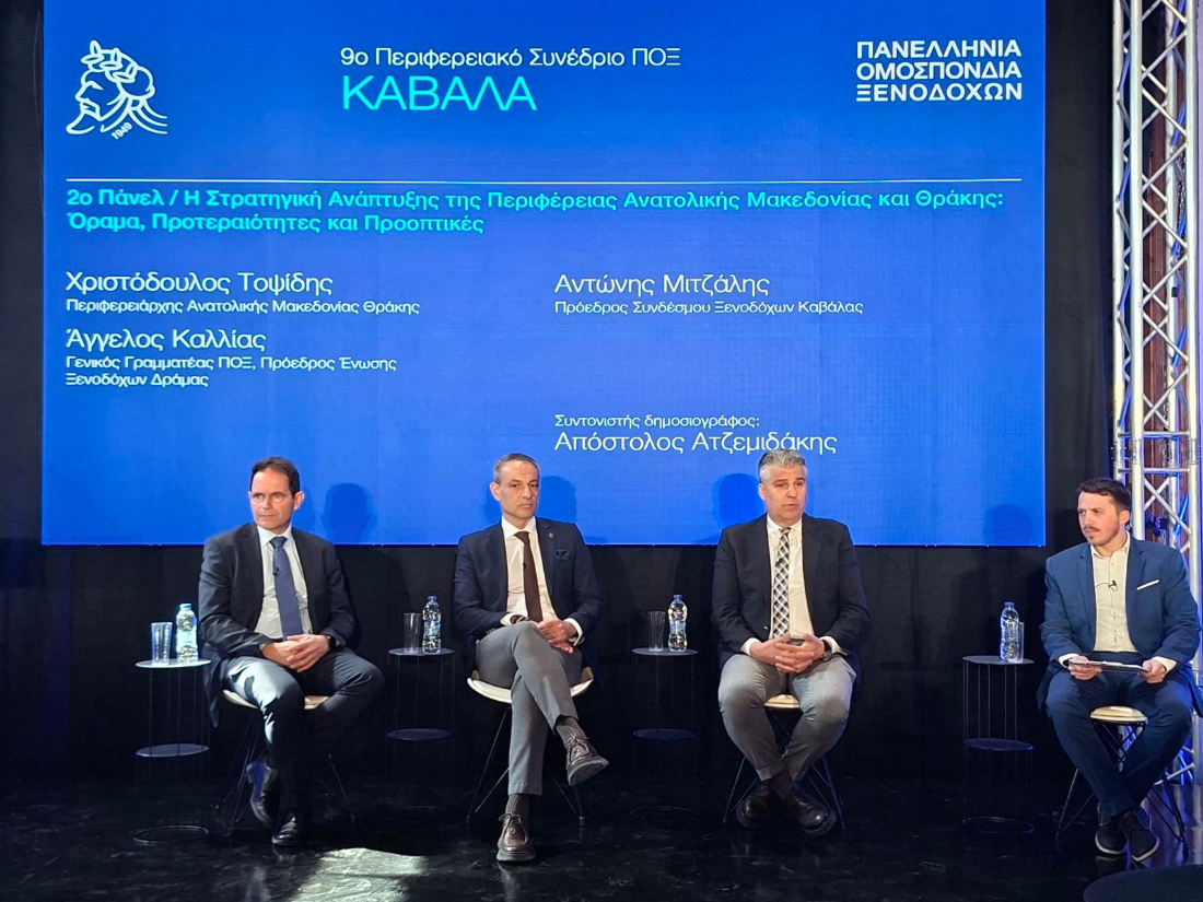 Στο πλαίσιο του 9ου Περιφερειακού Συνεδρίου της Πανελλήνιας Ομοσπονδίας Ξενοδόχων που πραγματοποιήθηκε σήμερα, Δευτέρα 9 Μαρτίου 2026, στην Καβάλα, στην αίθουσα της Μεγάλης Λέσχης, ο Περιφερειάρχης Ανατολικής Μακεδονίας και Θράκης, Χριστόδουλος Τοψίδης, παρουσίασε την ολοκληρωμένη στρατηγική τουριστικής ανάπτυξης της Περιφέρειας, με τίτλο: «Όραμα, Προτεραιότητες και Προοπτικές».