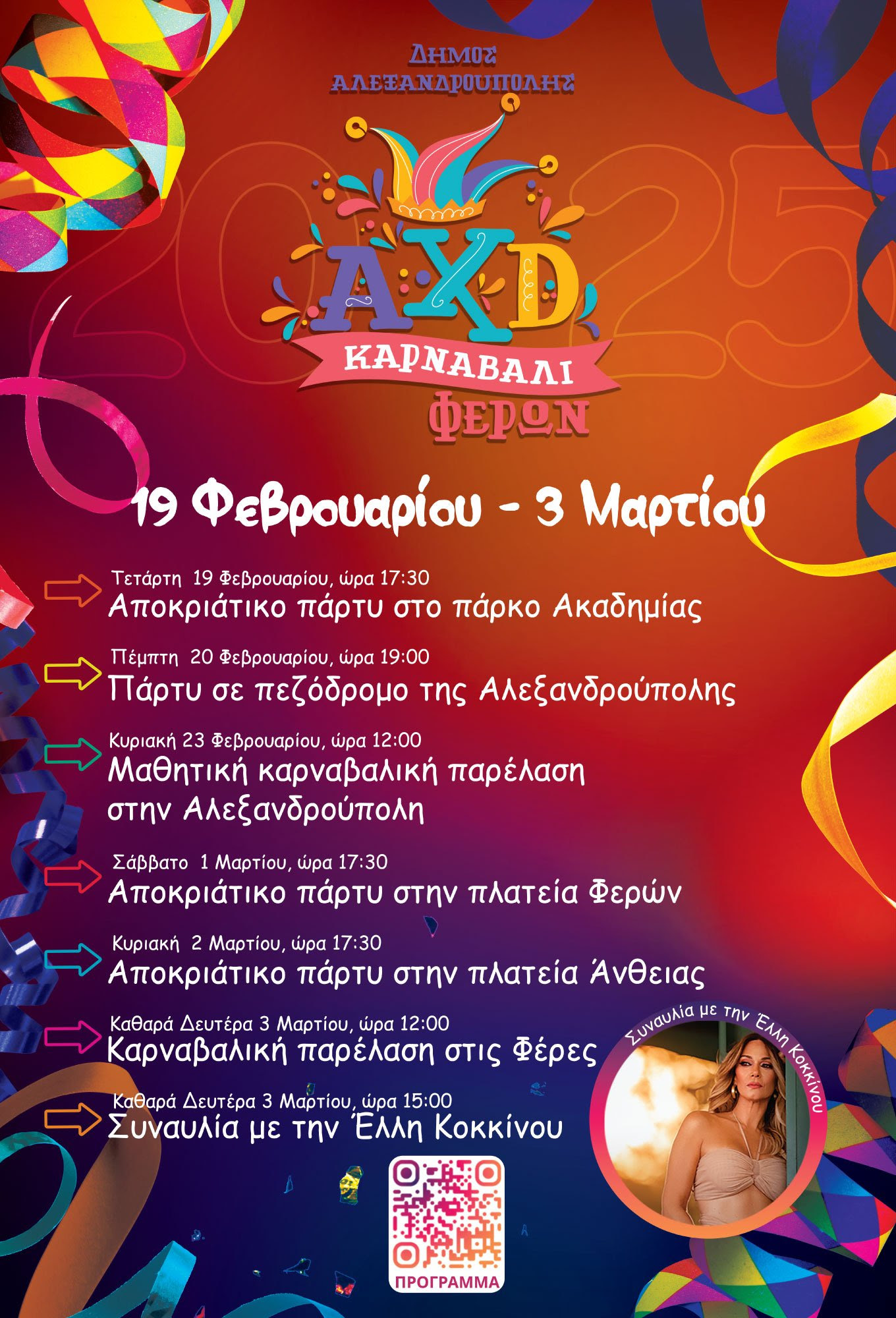 Την Κυριακή 23 Φεβρουαρίου, η μαθητική καρναβαλική παρέλαση στην Αλεξανδρούπολη δίνει το έναυσμα για γιορτή, ενώ οι αποκριάτικες εκδηλώσεις κορυφώνονται την Καθαρά Δευτέρα στις Φέρες με τη μεγάλη καρναβαλική παρέλαση, συνοδευόμενη από παραδοσιακή, δωρεάν φασολάδα και λαχταριστά εδέσματα για όλους. Η αποκριάτικη διάθεση απογειώνεται με τη φαντασμαγορική συναυλία της Έλλης Κοκκίνου, που θα ξεσηκώσει το κοινό με τις επιτυχίες της, μετατρέποντας την πλατεία των Φερών σε μια γιορτινή σκηνή γεμάτη διασκέδαση και κέφι.